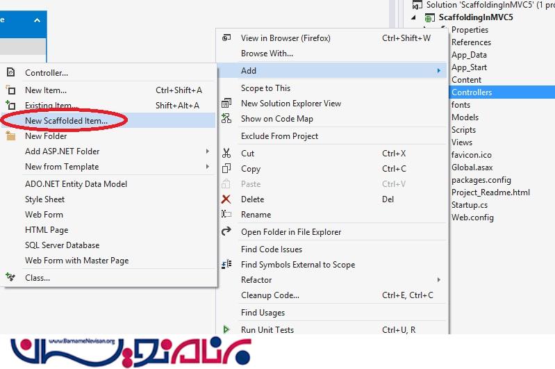 روی کنترلر کلیک راست کرده و Add new scaffolded item را انتخاب میکنیم.