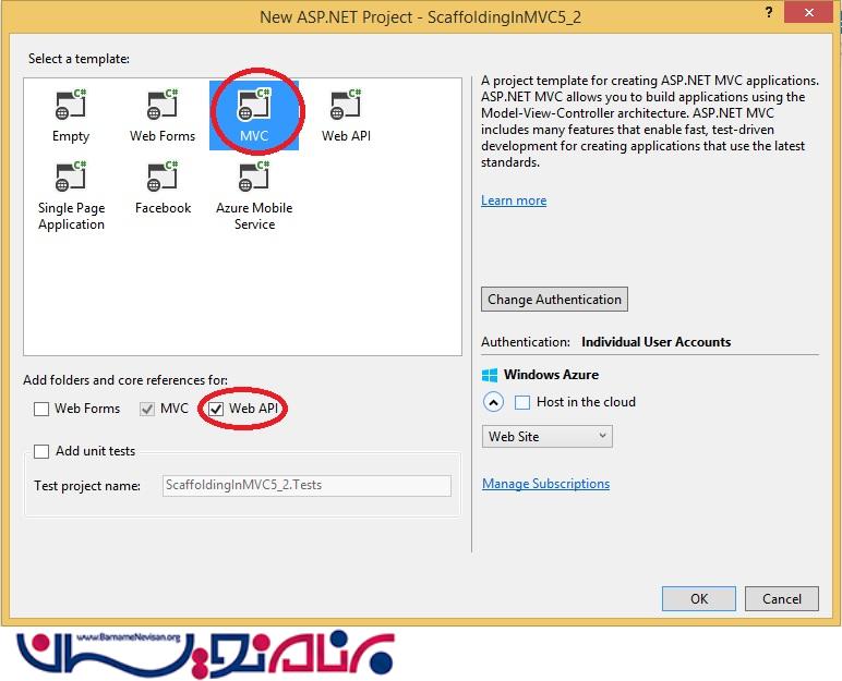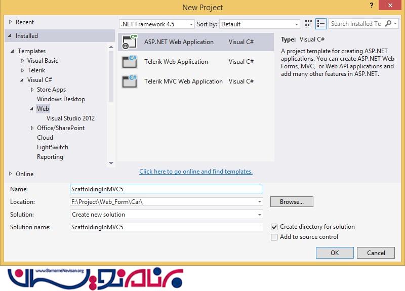 برای درک بهتر آن یک مثال آورده ایم. در اینجا از Visual Studio 2013 MVC 5 و WebAPI و Entity استفاده شده است . برای شروع یک پروژه با نام ScaffoldingInMvc5 ایجاد میکنیم.