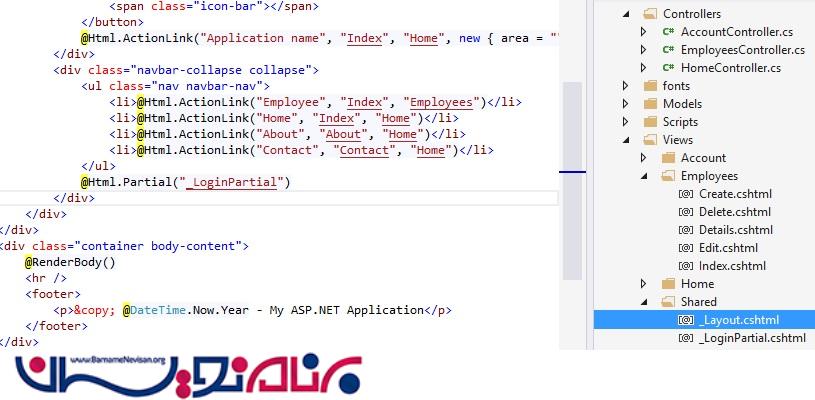 برای چک کردن برنامه به فایل Layout.cshtml_ رفته، و مانند زیر یک لینک برای کنترلر جدید ایجاد میکنیم.