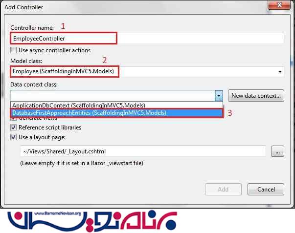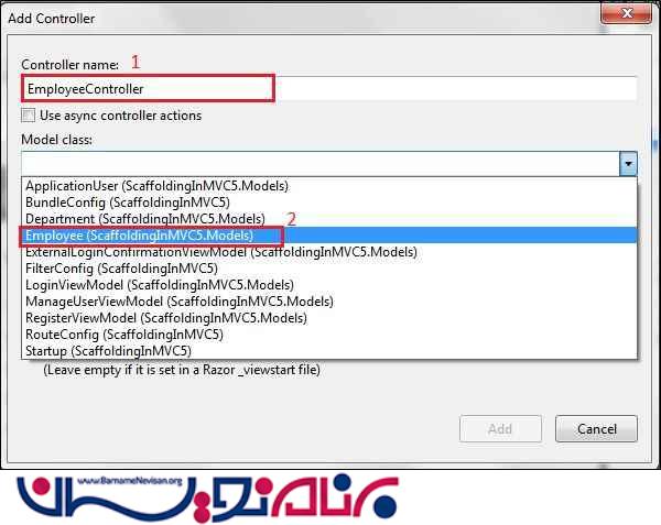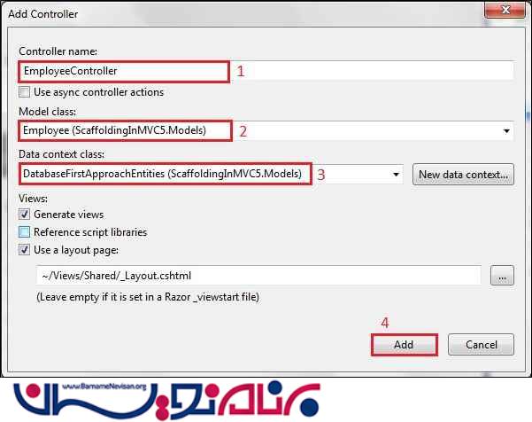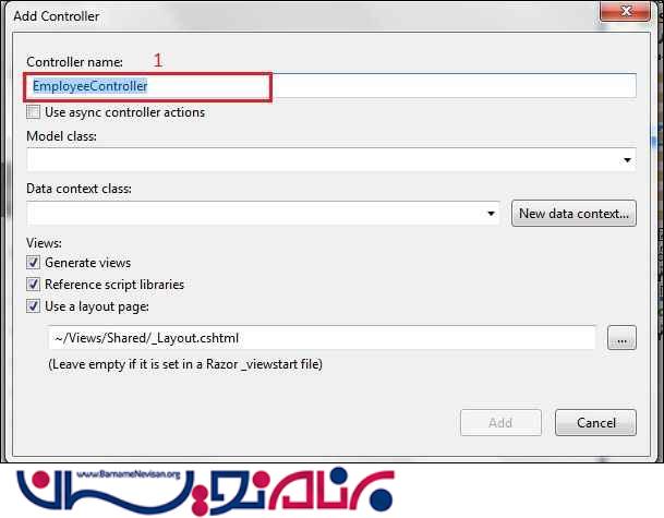 در پنجره باز شده نام کنترلردرخواست می شود. که در اینجا آن را EmployeeController قراردادیم.