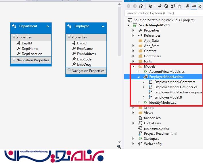 در تصویر بالا مشاهده میکنید بعد از اضافه شدن Entity data model ، در پوشه models فایلی با نام EmployeeModel ایجاد شده است. پروژه را rebuild کنید. داده ها به پروژه اضافه شده است. زمان آن رسیده است تا عملیات CRUD به صوت خودکار ایجاد شوند.
