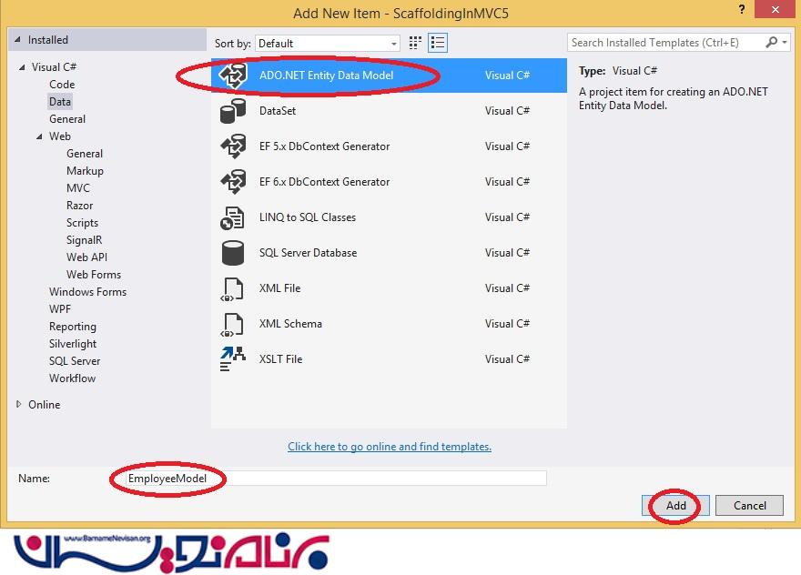 روی Models کلیک راست کرده و از قسمت add new item به پنجره زیر دسترسی پیدا خواهیم کرد.