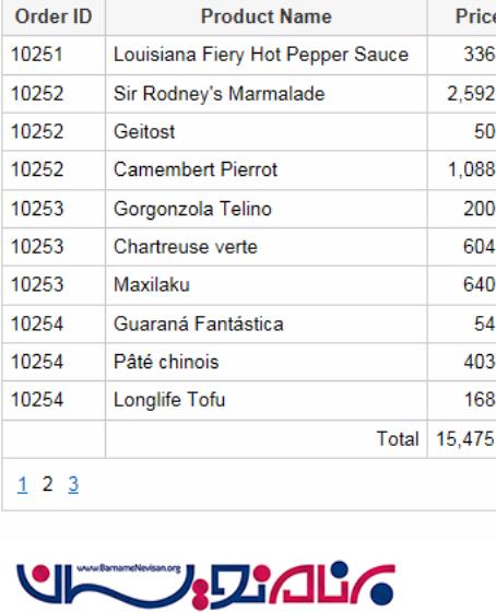 GridViewfh به همراه اطلاعات خود در متد Load صفحه قرار دارد . Query اطلاعات را از جداول Orders , Product و قیمت مربوط به آن محصول می گیرد .مجموع قیمت محصولات محاسبه و در یک Cell در انتای کنترل GridView به نمایش در می آید .