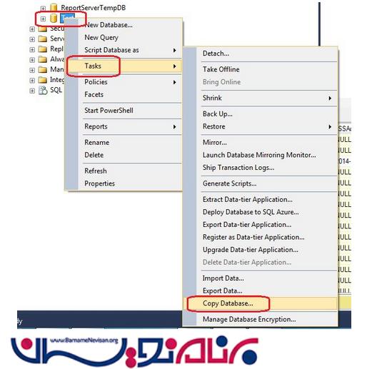 سپس بر روی بانک اطلاعاتی ( در این این مثال اسم بانک اطلاعاتی ما Test1 است )راست کلیک کرده و درTasks >Copy Database را انتخاب کنید