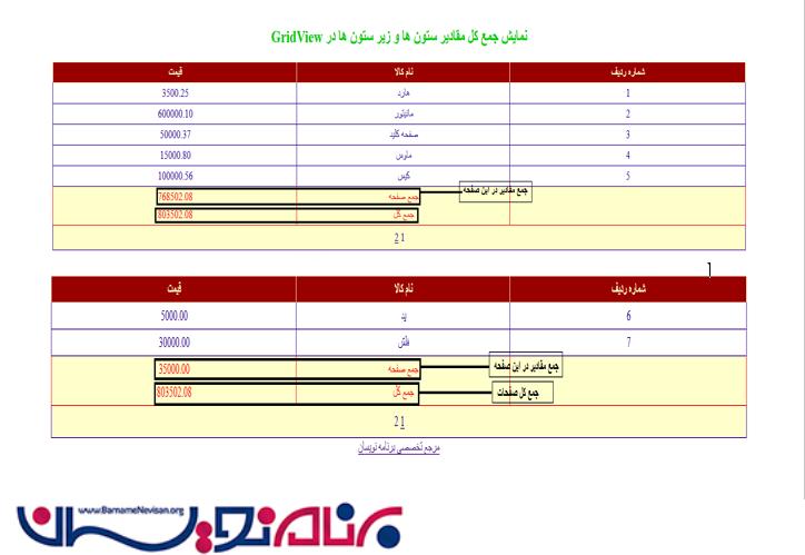 جمع کل ستون ها و زیرمجموع ستون ها در GridView