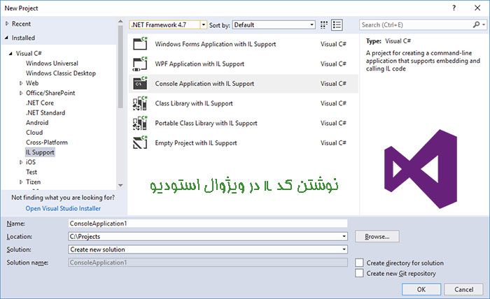 پس از نصب افزونه، قالبهای جدید برنامه برایمان ایجاد میشود و میتوانیم فایلهای IL را به سولوشن موجود اضافه کنیم.