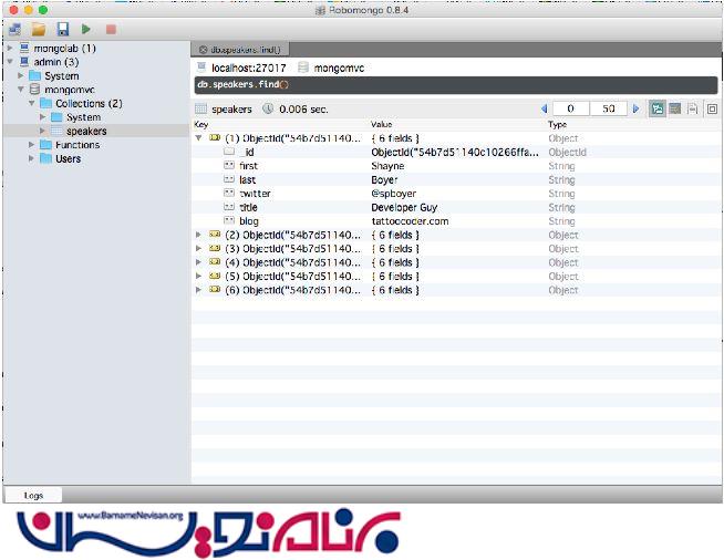 بعد از اجرا ی Post شما هم می توانید با پرس و جو نقطه پایانی Speakers و یا به صورت مستقیم درRobomongo ذخیره داده که اضافه شده است را ببینید