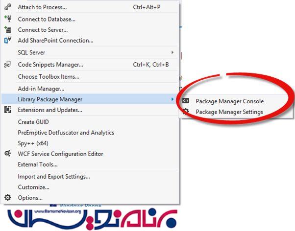 ابتدا از منوی tools گزینه library Pakage Manager و سپس pakage manager Console را انتخاب کنید