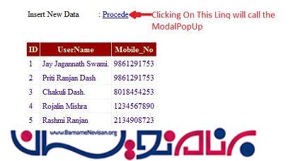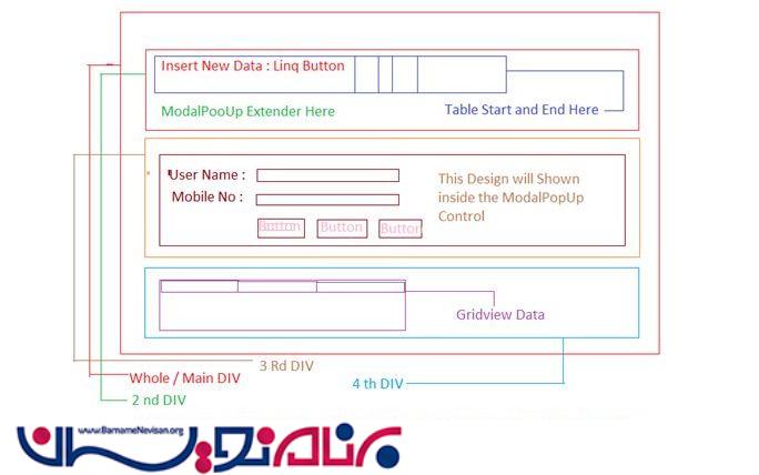 روال کار به این شکل خواهد بود که ابتدا یک کنترل ModalPopUP ایجاد کنیم سپس اعتبار سنجی فیلد های ورودی انجام شود ، ذخیره اطلاعت در پایگاه داده و درآخر نمایش اطلاعات ذخیره شده در یک گریدویو.