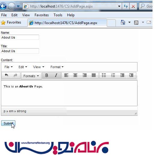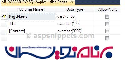 یک جدول که دارای سه فیلد می باشد میسازیم یک فیلد PageName برای نگهداری نام صفحه که به دلیل منحصر به فرد بودن آنرا کلید اصلی جدول قرار میدهیم و یک عنوان و یک فیلد محتوا در نظر میگیریم: