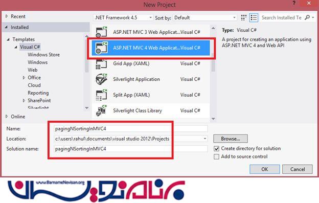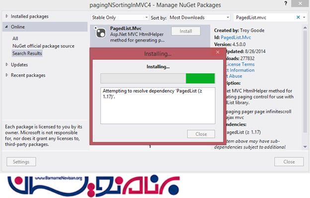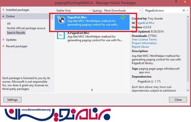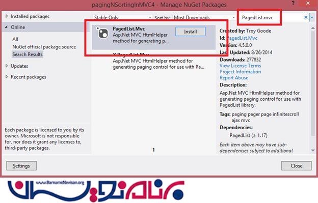در پنجره Solution Explorer روی پرو] خود کلیک راست کنید و Manage Nuget Packages را انتخاب کنید و در سمت راست PagedList را جستجو کنید و سپس آنرا نصب کنید: