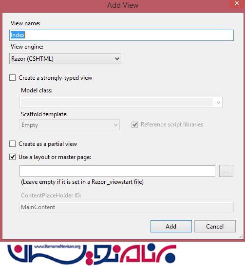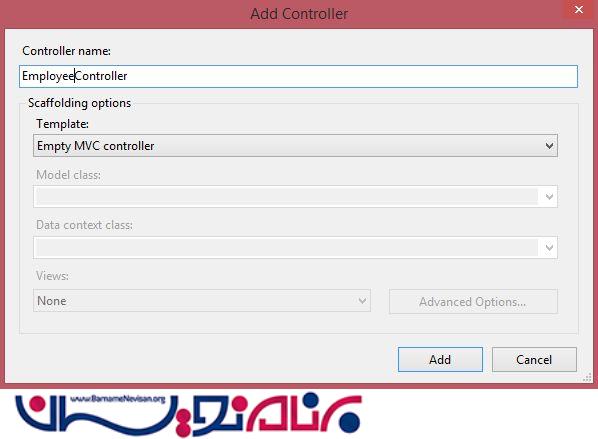 همانطور که مشاهده کردید به صورت تصویری همراه با توضیحات لازم مدل خود را ساختیم حالا نیاز به ساخت Controller داریم پس روی پوشه Controllers کلیک راست کرده وگزینه Add و سپس Controller را انتخاب کنید و در پنجره ظاهر شده MVC Controller - Empty را انتخاب کرده و نام Employee را وارد نمایید: