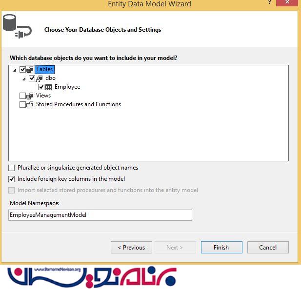 در این پنجره میتوانیم جدول خود را انتخاب کنیم و تیک گزینه ...Pluralize را بردارید این گزینه به این معنی می باشد که به صورت خودکاربرای نام جداول قوانین جمع و مفرد بودن را رعایت نماید مثلا اسم جمع جدول Person به People تبدیل میشودپس از انتخاب جدول خود رو گزینه Finish کلیک کنید :