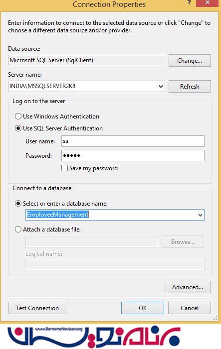 در این پنجره تنظیمات اتصال را انجام داده وپایگاه داده خود را انتخاب مینماییم و روی دکمه ok کلیک میکنیم: