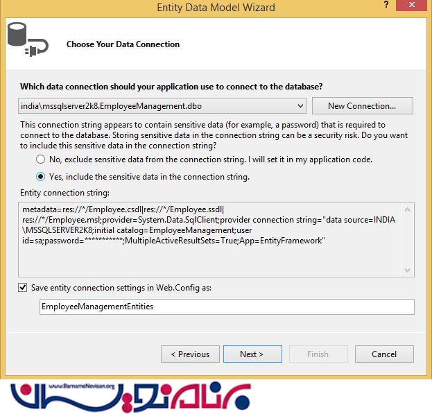 در این پنجره تیک ...save در پایین پنجره به این معنا میباشد که اگر تیک بزند رشته اتصال شما رادر فایل Web.Config ذخیره میکند: