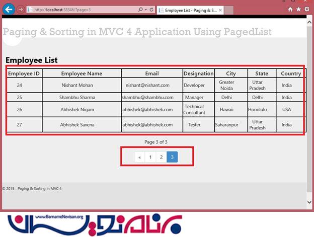 در ویو خود برای نمایش اطلاعات یک جدول ایجاد میکنیم و در پایین ویو بعد از جدول خود از PagedListPager برای صفحه بندی و فرستادن شماره صفحه به متد index استفاده شده است: