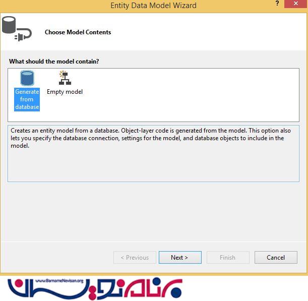 حال باید یک مدل به پروژه خود اضافه کنید روی نام پروژه کلیک راست کرده و از منوی ظاهر شده گزینه ADD و سپس New ADO.NEt Entity data Model را انتخاب کنید که پنجره زیر نمایان می شود: