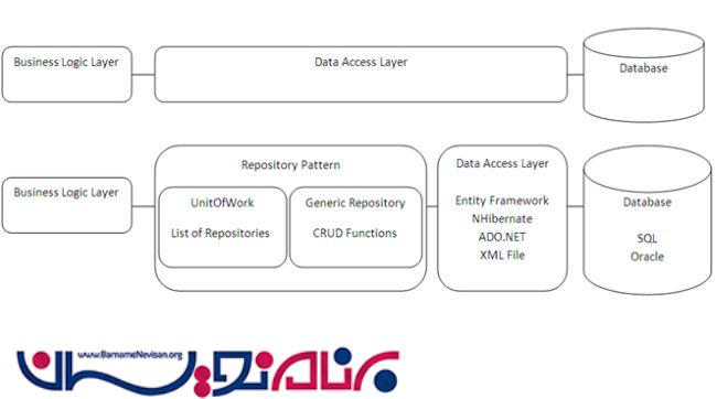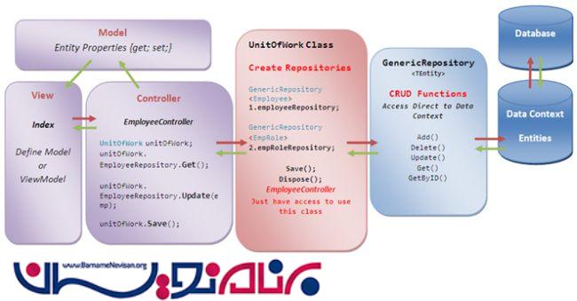 به همین ترتیب برای هر موجودی یک کنترلر در MVC تحت X کنترلر تولید میکنیم.فولدری میسازیم و نامش را به GenericRepository تغییر میدهیم و یک کلاس GenericRepository.cs تولید میکنیم. کلاس GenericRepository دارای توابع CRUD برای کار در زمینه داده ها و سپس یک فولدر جدید میسازیم نام آن را به UnitOfWork تغییر میدیم و سپس کلاسی با همین نام میسازیم. شما باید داخل این کلاس لیست مخزن ها برای هر موجودی راعلاوه بر متد های "ذخیره" و "مرتب کردن" بسازید. کنترلر ها فقط به واحد کار دسترسی دارند. شما لایه ی کاری و لایه ی داده تان را از هم جدا میکنید و هروقت که بخواهید میتوانید سیاستتان را عوض کنید و با ترجیح "ORM" دیگری مانند "NHibernate" مشکلی با لایه ی بالاتر مانند "Business" بوجود نمی آید.