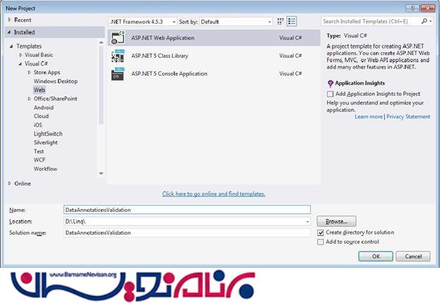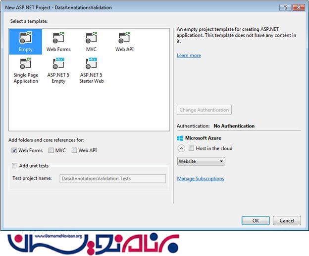 Create a new project using "File" -> "New" -> "Project..." then select web "ASP.NET Web Forms Application". Name it "DataAnnotationsValidation".