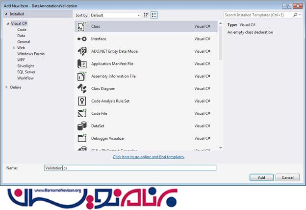 سپس یک کلاس با نام Validation.cs به پروژه اضافه می کنیم .