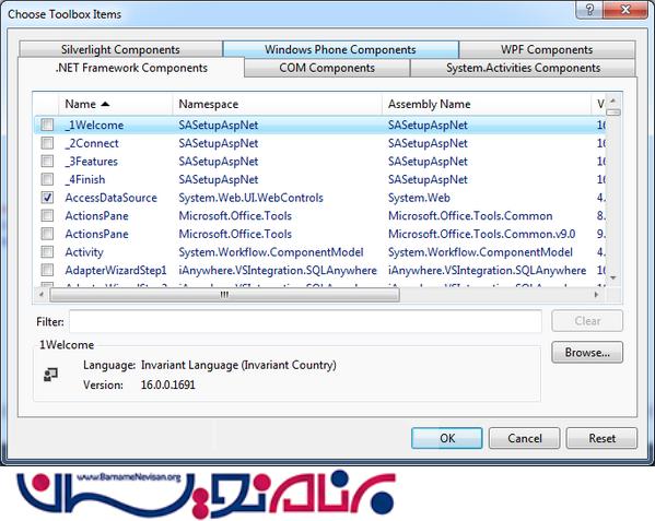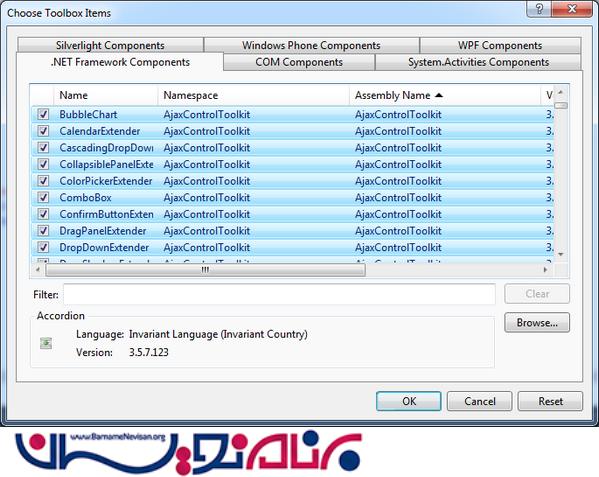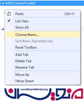 تمام کنترلهای حاضر در کتابخانه Ajax Control Toolkit در پنجره Choos Items ظاهر میشوند .مطالق تصویر زیر :