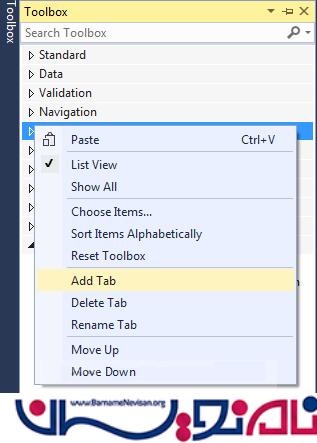 اکنون ویژوال استودیو را اجرا می کنیم , سپس روی جعبه ابزار راست کلیک می کنیم و گزینه AddTab را انتخاب می کنیم .