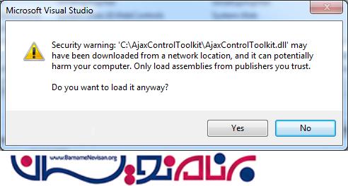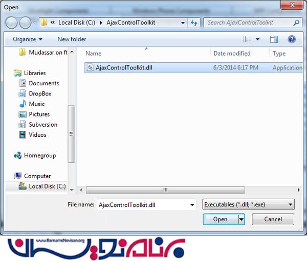 بر روی دکمه Browse کلیک کنید و کتابخانه Ajax Control Toolkit را از محلی که در آن قرار دارد انتخاب کنید و دکمه Open کلیک می کنیم .