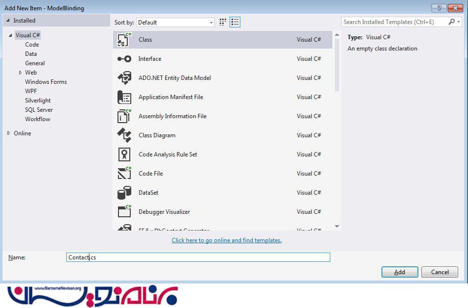 از لیست ظاهر شده class را انتخاب کنید و نام Contact را وارد کنید
