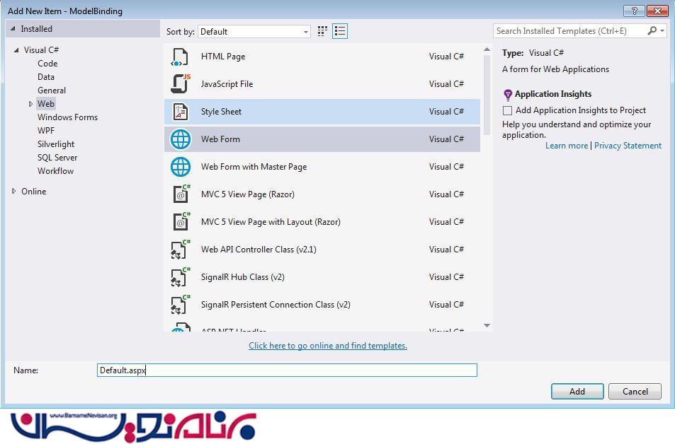 حال یک صفحه به نام default.aspx به پروژه خود اضافه کنید