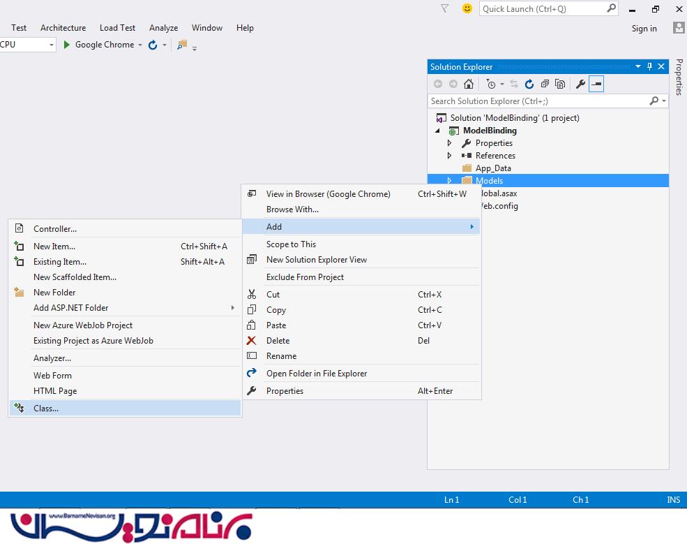 در پنجره solution explorer روی پوشه model کلیک راست کرده گزینه add و سپس class