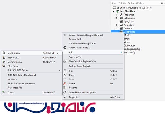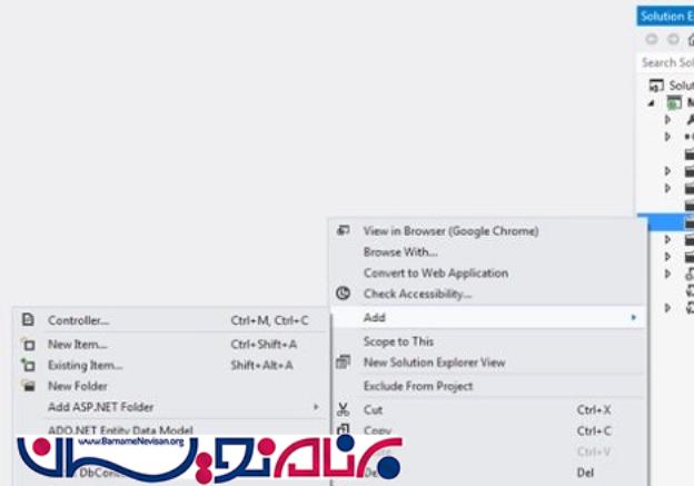 ابتدابرنامه ویژوال استدیو خود را باز کنید و یک پروژه جدید از نوع MVC بسازید سپس روی پوشه Models کلیک راست کرده Add و سپس Class را انتخاب کنید: