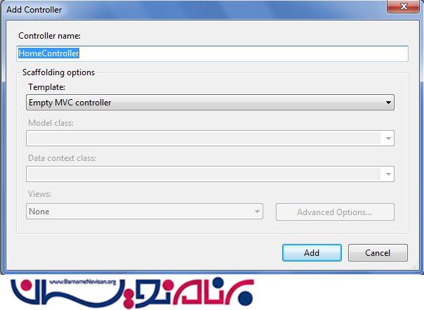 حال نوبت به ساخت کنترلر میرسه روی پوشه Controllers کلیک راست کرده و گزینه add سپس Controller را انتخاب کنید در صفحه ای که باز میشود در قسمت scaffolding options -> Template را Empty MVC Controller انتخاب کنید:
