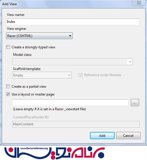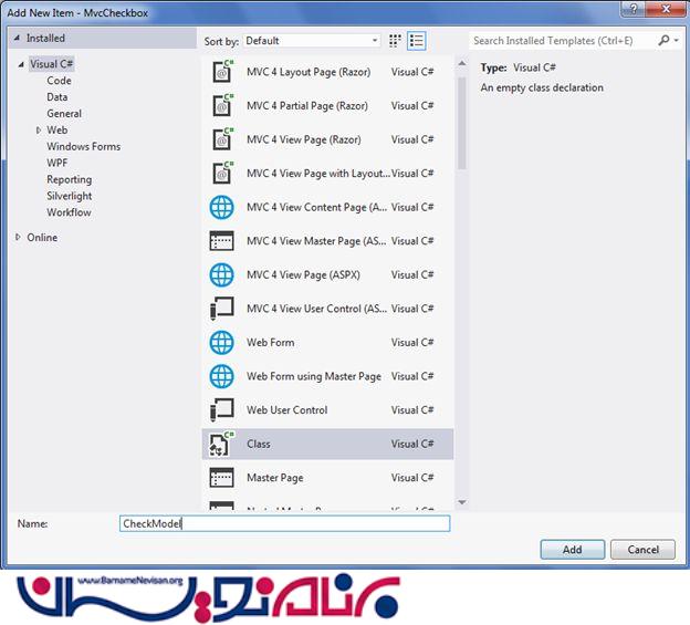 در صفحه ای که باز میشود نام CheckModel را وارد کنید وروی گزینه Add کلیک کنید:
