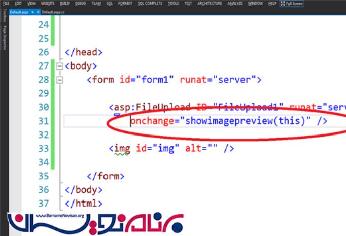سپس متد تعریف شده در اسکریپت بالا را در رویداد "()onchange" کنترل Fileupload قرار میدهیم .کد زیر را به تگ کنترل Fileupload اضافه میکنیم :