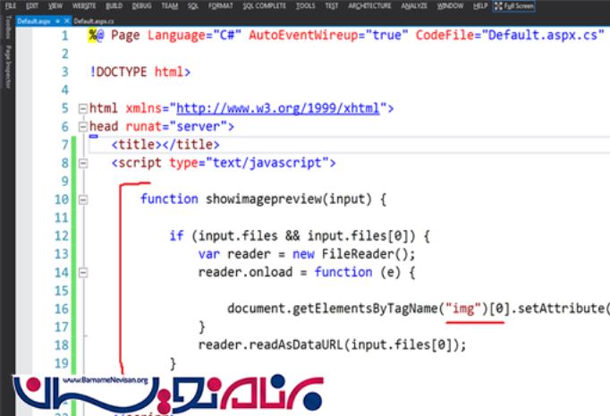 سپس در قسمت head صفحه یک تگ اسکریپت باز کرده و متدی با نام "()showimagepreview" را می نویسیم مانند کد زیر :
