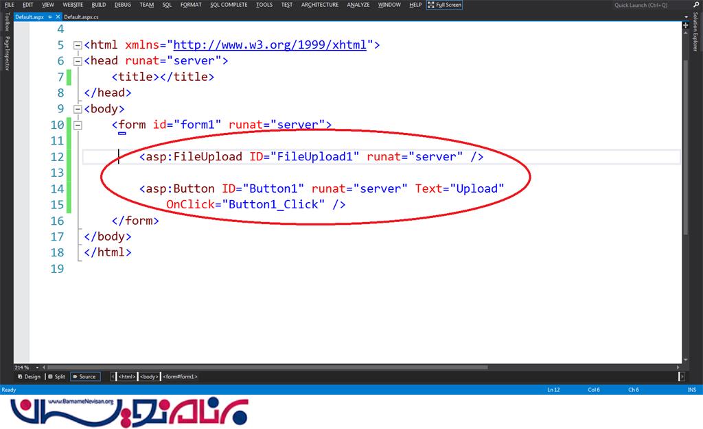 اکنون یک کنترل FileUpload با نام "FileUpload1" و یک کنترل button با نام "Upload" به صفحه اضافه کنیم .