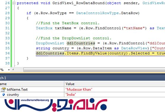 در داخل رویداد RowDataBound ابتدا از اتصال GidView به DataTable اطمینان حاصل میشود , سپس محتوای داخل TextBox و DropDownList از طریق ID آن سطر تشخیص داده می شود و در ادامه محتوای آناها به پارامتر مورد نظر ارسال می گردد .