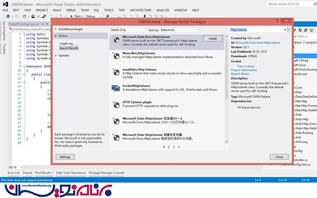 سپس باید کتابخانه های لازم برای Microsoft.Owin.Host.HttpListener به پروژه خود از طریق nugget به پروژه خود اضافه کنیم.