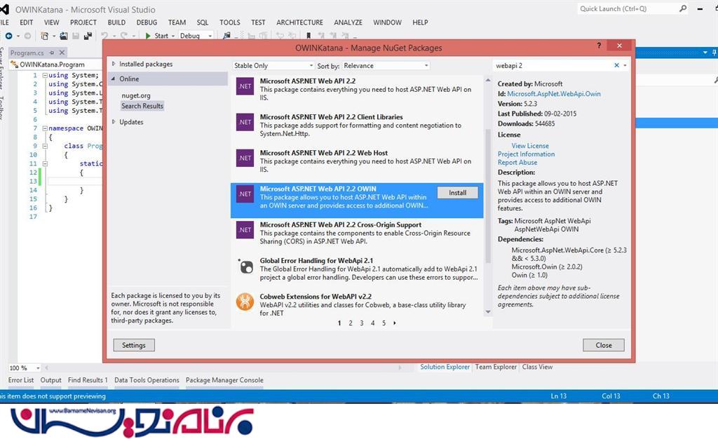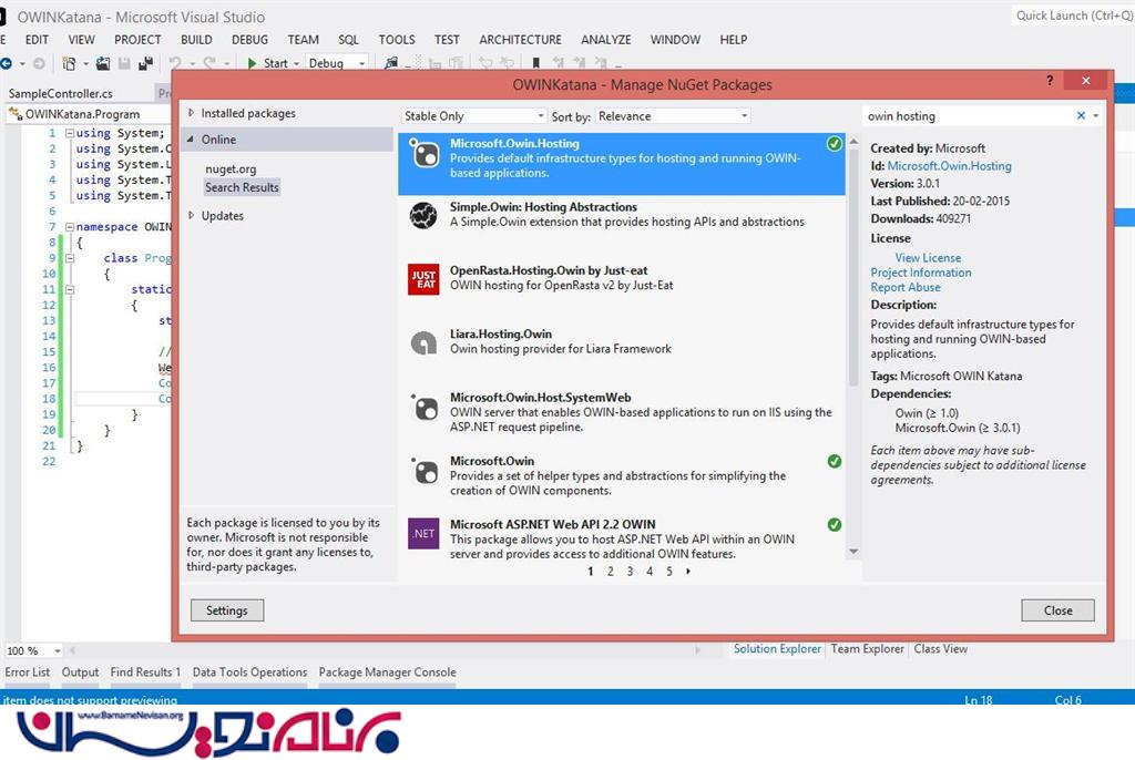 بنابراین ما میزبان و سرور در محل داریم سپس ما نیاز به اضافه کردن یک کامپوننت middleware ، در اینجا Web API داریم سپس باید رفرنس WebApi 2.2 Owin و کتابخانه Owin Hostingرا اضافه کنیم که این کار با استفاده از nuget انجام میدهیم: