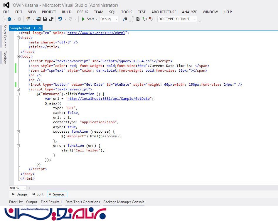 و در گام آخر اضافه کردن HTML به صفحه HTML و فراخوانی متد Web Api برای گرفتن تاریخ از سرور: