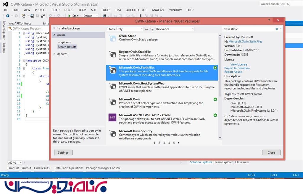 گام بعدی اضافه کردن کامپوننت های middleware دیگر می باشد در اینجا اضافه کردن کتابخانه ای (microsoft.owin.staticfiles)برای پشتیبانی میزبانی صفحات HTML ما میزبان صفحات HTML در برنامه کنسول میخواهیم :