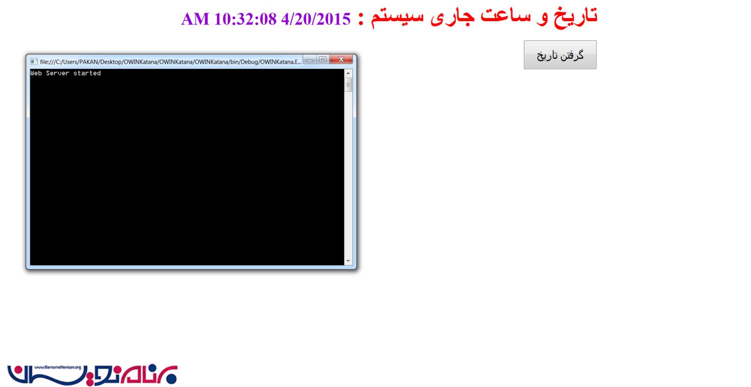 مراحل تمام است حال باید برنامه کنسول را اجرا کنید و شما میتوانید مسیر صفحه HTML روی همان Url که Web Api است (localhost/pages/sample.html) را بنویسید سپس روی دکمه دریافت تاریخ کلیک کنید که درخواست شما برای Web Api فرستاده میشود: