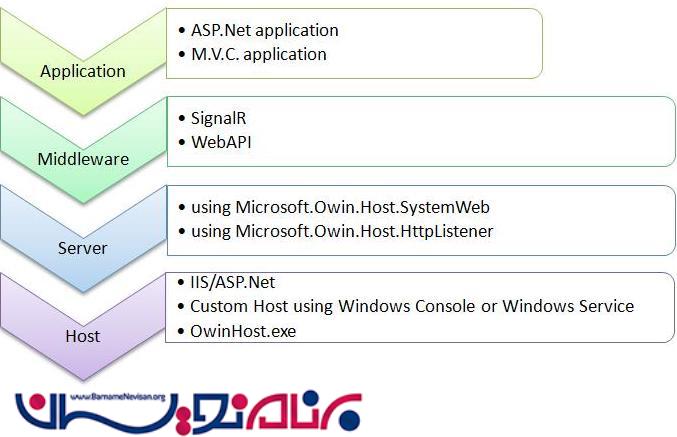 در هر معماری نرم افزار ASP.Net عادی، ما لایه های مختلف طبقه بندی شده به عنوان میزبان، سرور و برنامه اصلی داریم. در این صورت، IIS به عنوان سرور و همچنین به عنوان میزبان عمل می کند. اما در مورد ساختار بر اساس OWIN ، ما می توانیم 4 لایه مختلف داشته باشیم :