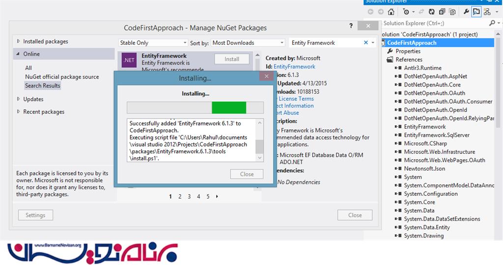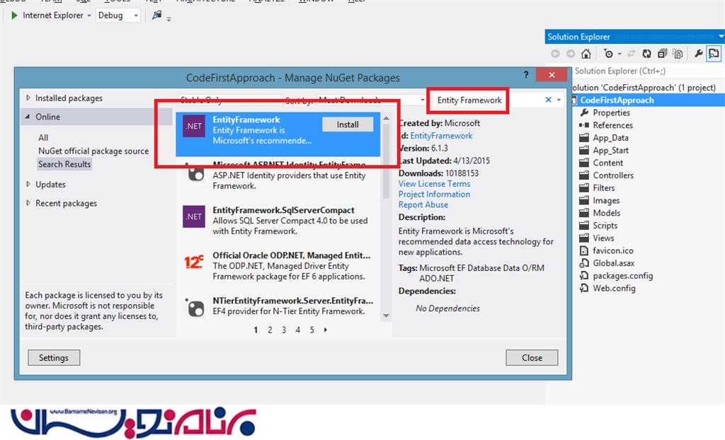 پس از پیدا کردن Ef روی گزینه install کلیک و آنرا نصب کنید تا رفرنس های لازم به پروژه اضافه شود: