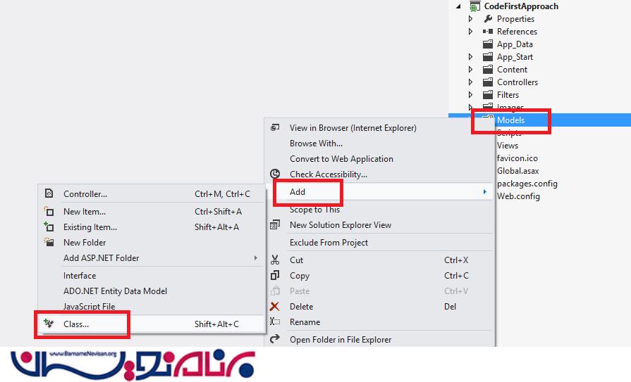 حال روی پوشه Model کلیک راست بعد گزینه Add و سپس Class را انتخاب کنید: