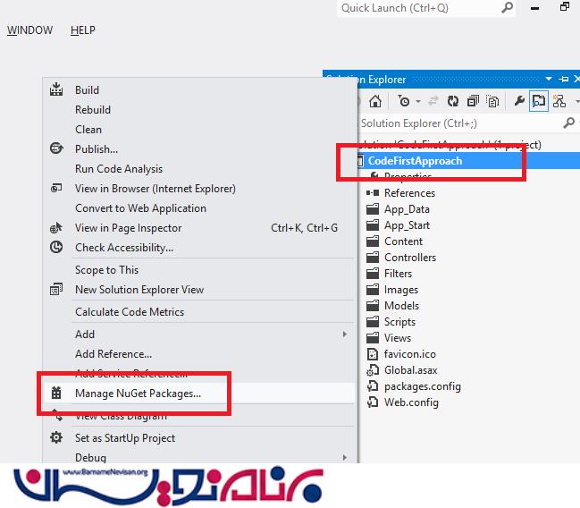 سپس در پنجره Solution Explorer روی نام پروژه کلیک راست کرده و از منوی ظاهر شده Manage Nuget Packages را انتخاب کنید: