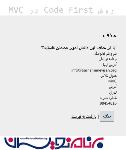 ودر آخر برای حذف یک رکورد از جدول ابتدا در حالت get آن رکورد را پیدا کرده و اطلاعات آنرا برای گرفتن تایید از کاربر نمایش دهیم: