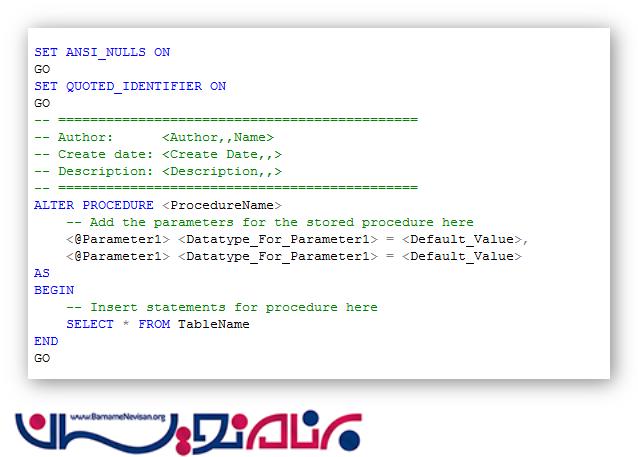 در ادامه نحوه تغییر دستورات Stored procedure را می توانید مشاهده کنید .همانطور که در اتصویر مشاهده میکنید برای این عمل از کلمه کلیدی ALTER استفاده کنیم .