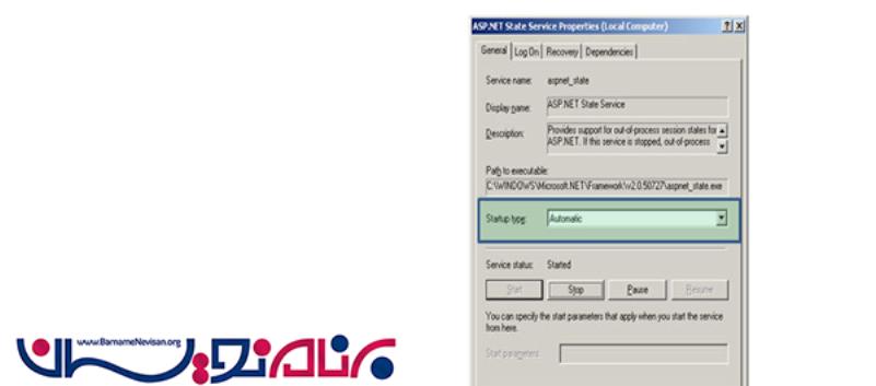 به صورت پیش فرض "Startup Type" از ASP.NET به Manual تنظیم شده است و ما باید آن را به Automatic تغییر دهیم .
