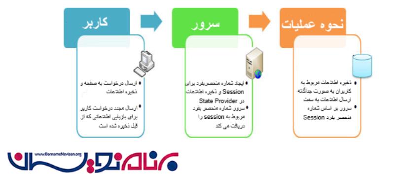 روند نگهداری session state به میتوانید در تصویر زیر مشاهده نمایید که در ابتدا کاربر به وب سایت یا نرم افزار ما مراجعه می کند , سپس اطلاعات مربوط به کاربر در سمت سرور ذخیره می کند , سپس اطلاعات مربوط به session هر کاربر به صورت یک جدول در IIS ایجاد میشود و بعداً اگر کاربر به سمت سرور درخواستی ارسال کند ابتدا شماره منحصر بفردی که در session به آن اختصاص داده شد چک میشود و اگر معتبر بود اطلاعات به آن کاربر بازیابی می شود .
